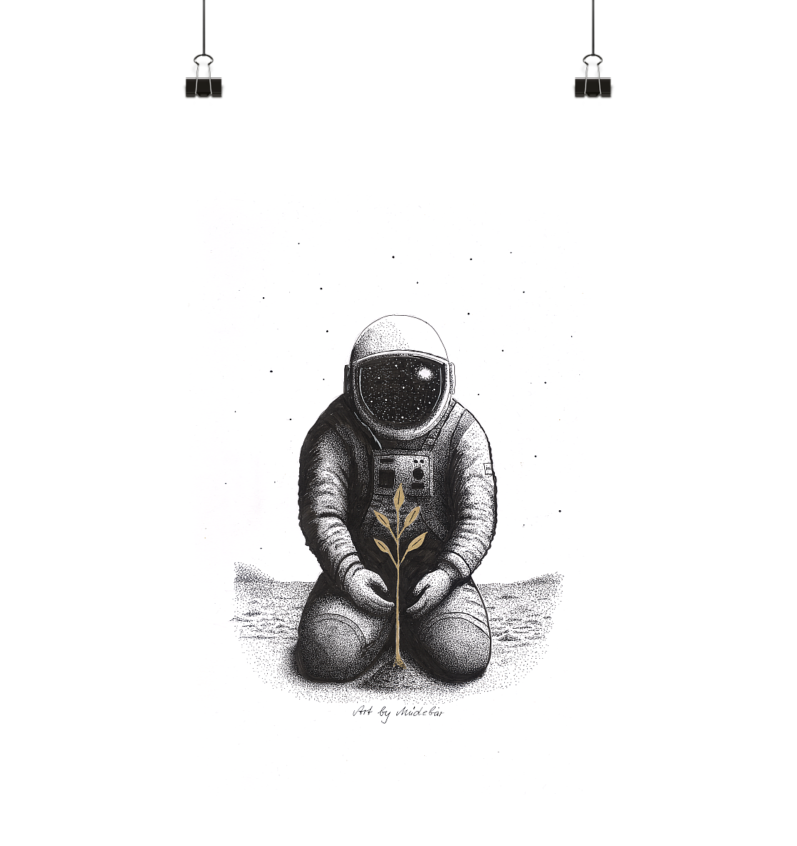 Warum dieses Motiv? Weil Hoffnung leise ist. Der Astronaut steht für das Große, der Keimling für das Kleine, das wir bewahren. Minimalistische Komposition, viel Weißraum, klare Linien – typisch Müdebär. Passt zu Wohnzimmer, Studio, Schlafzimmer, Büro – überall, wo ein bisschen Ruhe, Tiefe und ein Hauch Gold gut tun.